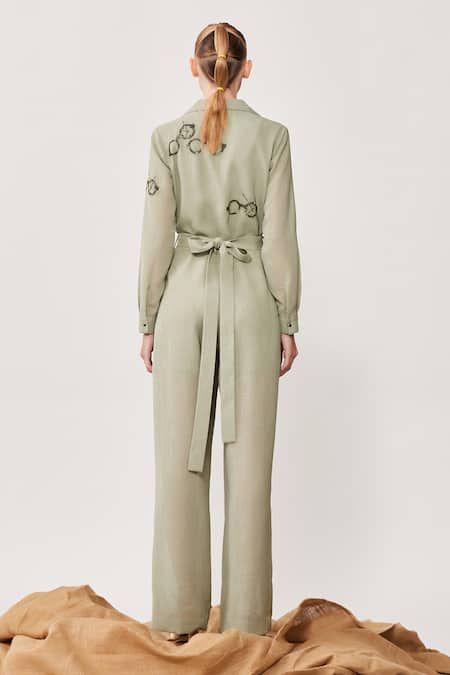 Sage jumpsuit with time vision embroidery & stitch line detail. Comes with belt.