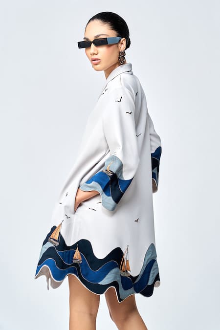 Wave cutwork hem, Applique work in waves, Boat motifs embroidery