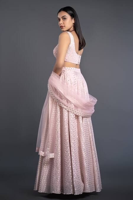 Powder pink lehenga in brocade base with foil prints. Paired with sequin chikankari blouse & dupatta.