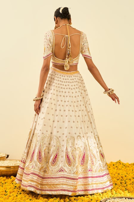 Daisy white pure raw silk lehenga with gotapatti & highlighted with basra moti. Paired with a embroidered blouse & a mustard silk organza dupatta.