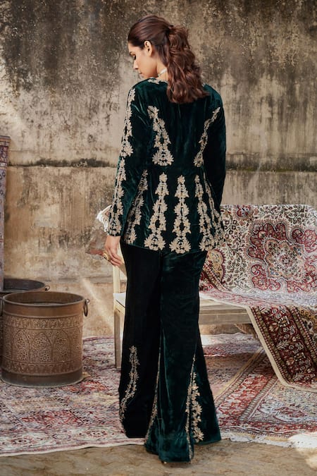 Green velvet jacket featuring full sleeves and Mughal bloom embroidery. Paired with a matching sharara that has intricate embroidery details.