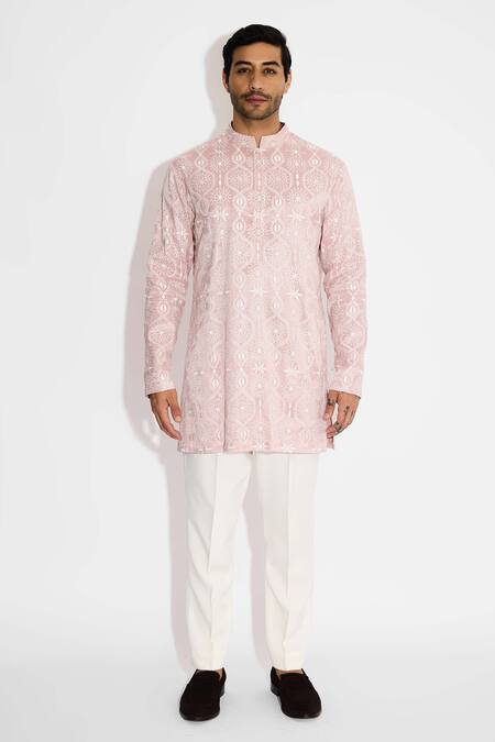 Light rose pink kurta made from tissue satin featuring intricate embroidery