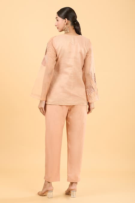 Peach short shirt tunic featuring thread embroidery in a leaf applique pattern. Paired with matching pants for a coordinated look.