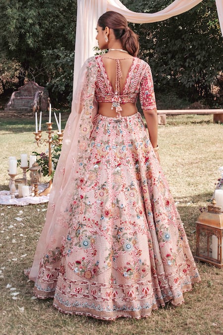 Pink Silk, Organza Pearls, Sequins, Beads, Embroidery Plunge Floral Lehenga Set