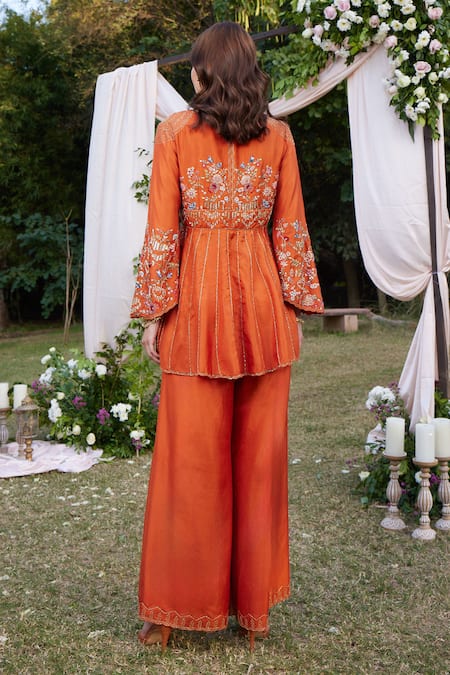 Brown peplum top featuring a V neck, long sleeves, and intricate embroidery with pearls, resham, sequins, and stones. Paired with matching pants showcasing sunset embroidery details.