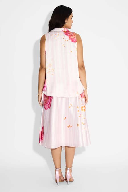 V-neck design with floral accents, Pleated hem detail, Lightweight poly satin fabric