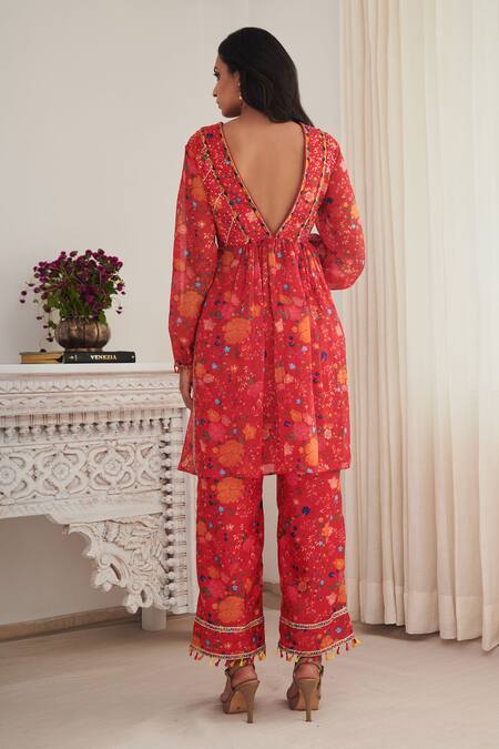 Red floral print pleated kurta featuring a plunging V neckline and long sleeves. Paired with a printed pant adorned with tassle-detailed hems.