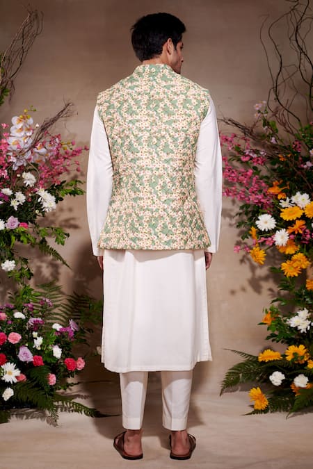 Green Silk Embroidery Floral Print Nehru Jacket