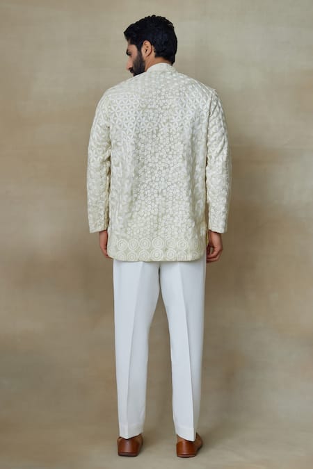 Resham embroidery in floral and geometric patterns, Pearl embellishments, Mandarin collar design
