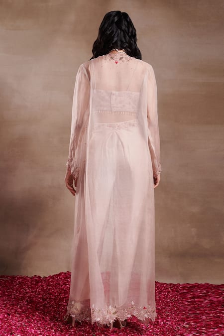 Pink Organza Tassels Herbs Lips Long Shrug And Embroidered Dhoti Pant Set