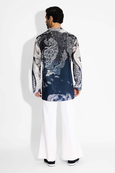 Obsidian blue kurta featuring an ombre swirl print with a V neckline