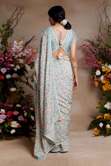 Blue saree featuring floral print and 3D cutwork embroidery. Paired with a blouse that has pleats and a V neckline.