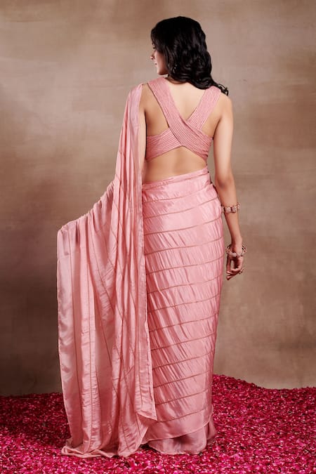 Pink saree featuring pintucks and cutdana embroidery in a stripe pattern. Accompanied by a wrap style sleeveless blouse with V neck.