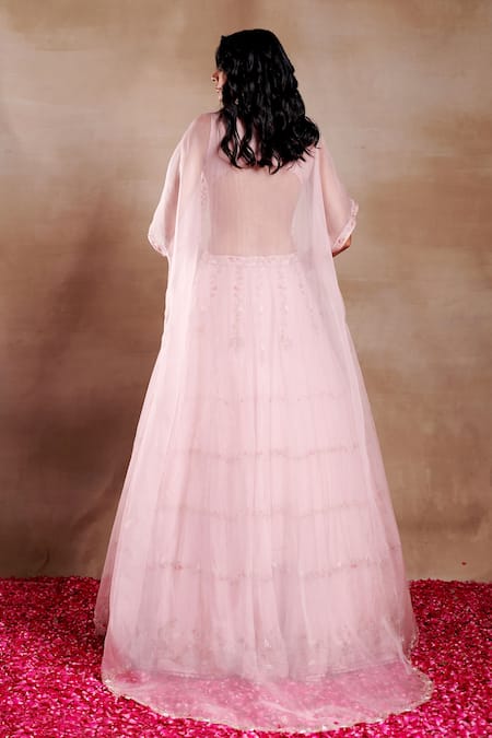 Pink lehenga featuring floral embroidery with an open front sheer jacket. Paired with a V neck blouse adorned with beads, cutdana, and sequins.