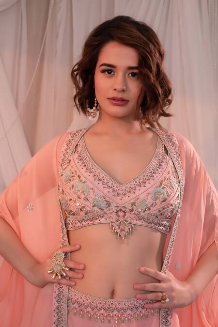 Pink padded blouse featuring floral embellishment with sequin & bead work with tassel drops. Paired with an embellished waist sharara and a cape.