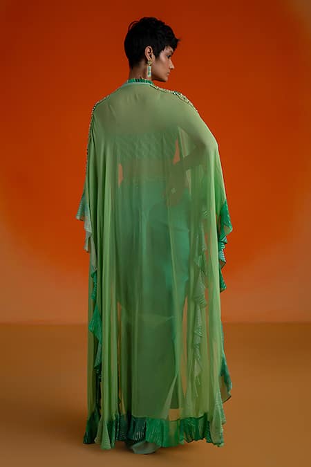 Green floral print dhoti featuring a draped cape and embellished blouse. The ensemble includes crystal and pearl embroidery on modal satin and georgette fabric.