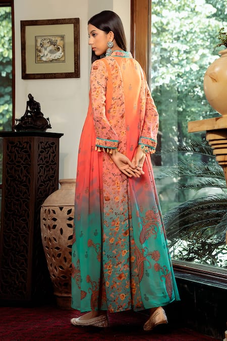 Blue and peach ombre kalidar featuring jamewar floral vine printed motifs embellished with placed sequin tassels and pleated details