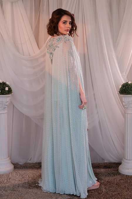 Blue asymmetric kaftan featuring mukaish embellishment and attached lining. Paired with a matching sharara pant for a complete look.