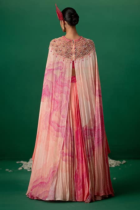 Pink lehenga featuring ombre floral prints and crystal-pearls embroidery. Paired with a matching blouse and cape made from georgette and modal satin.
