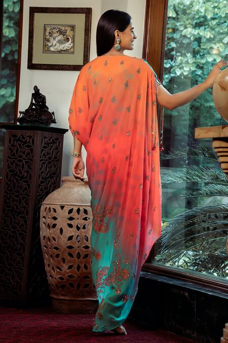 Blue and peach asymmetric draped kurta featuring floral paisley print and sequin embellishments. Paired with tasselled border pant and inner lining.