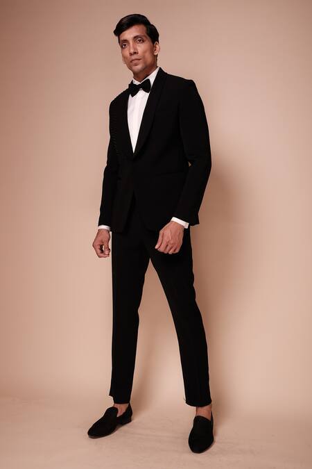 Black shawl lapel tuxedo with embroidered one side diagonal strokes. Paired with tonal shirt & trousers.