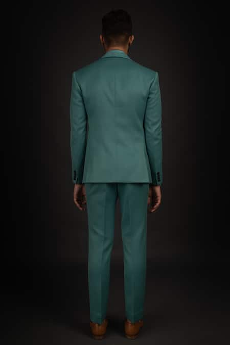 Teal blue suit with shawl lapel, patch pockets and full sleeves. Comes with quilted shirt and pant set.