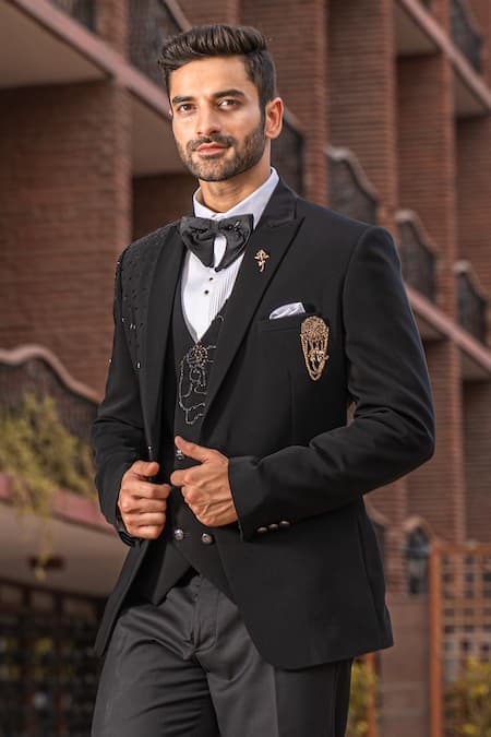 Black tuxedo with placement embroidery & patch pocket. Paired with embroidered waistcoat, shirt, pant & bow.