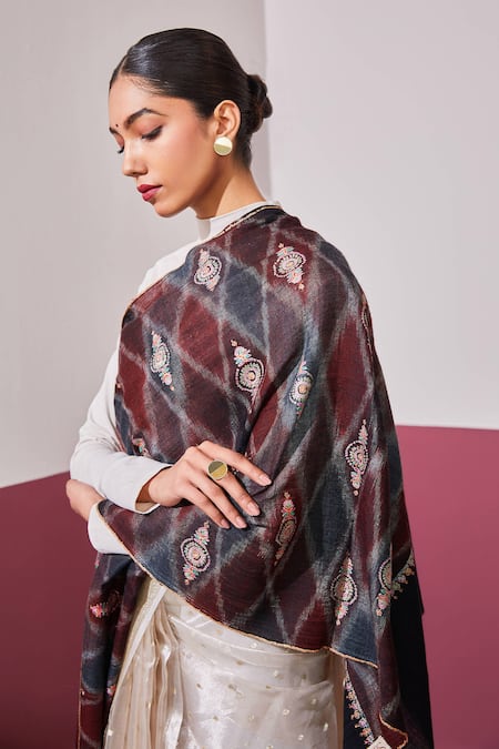 Denim blue and maroon stole featuring argyle woven motifs with thread embroidery in a floral pattern