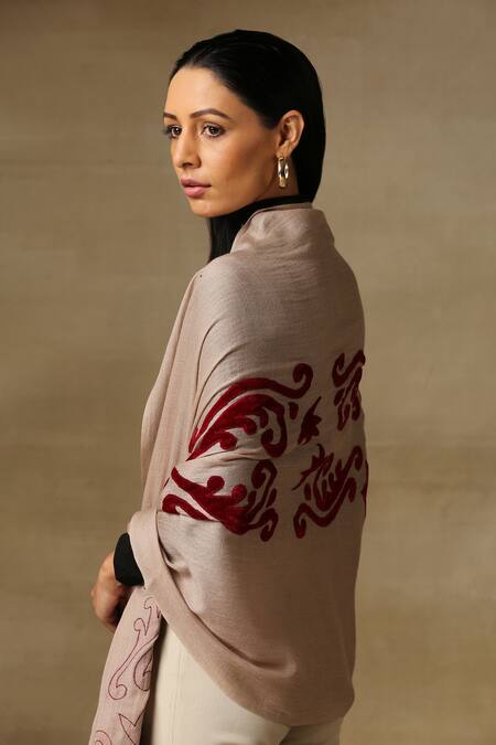 Beige stole made from handloom pashmina featuring intricate red floral embroidery