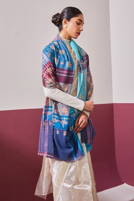 Blue and violet stole featuring checkered woven motifs with thread embroidery in a floral pattern