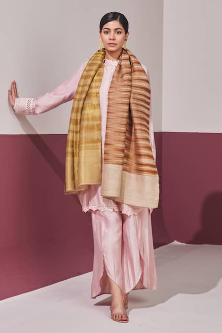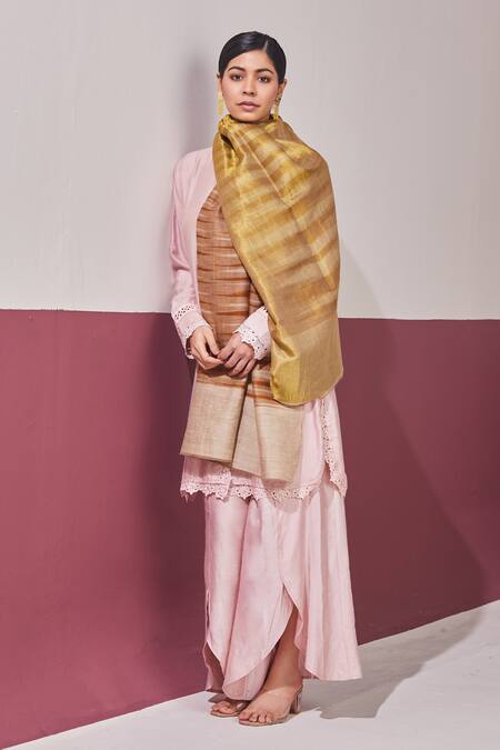 Bronze reversible stole featuring ikkat design weave on one side and golden zari on the other