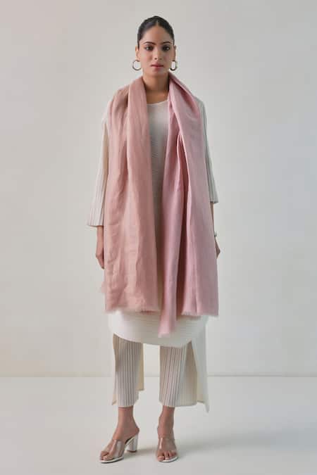 Baby pink stole crafted from fine count wool featuring elegant zari accents