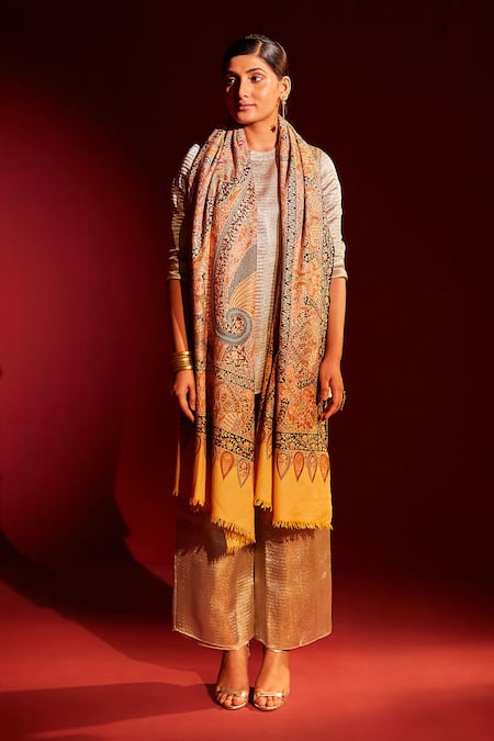 Fringes at the bottom, Striped mehraab design, Handloomed Pashmina texture