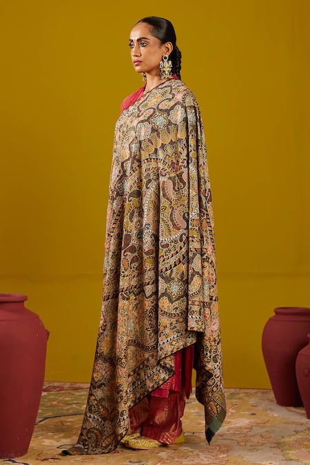 Multicolored Kalamkari shawl featuring handpainted floral motifs