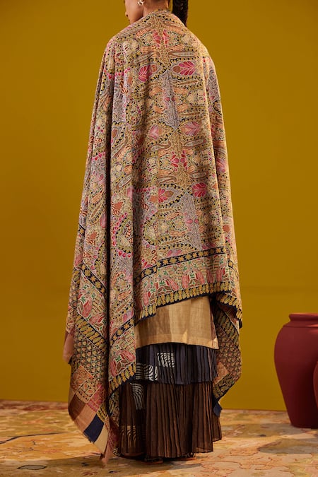 Multicolored handloomed Pashmina shawl featuring intricate Kalamkari floral and ambi designs