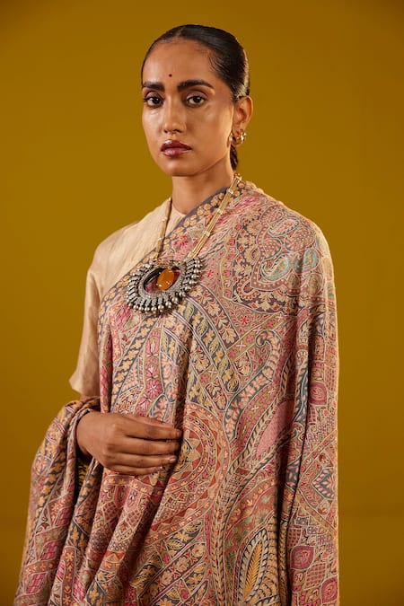 Multicolored shawl featuring intricate Kalamkari work and a grey mehraab