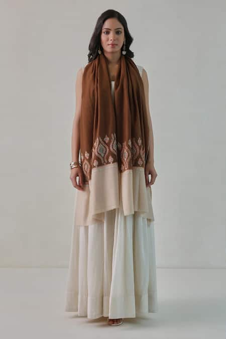 Brown stole featuring thread embroidery in a tear drop pattern on the border