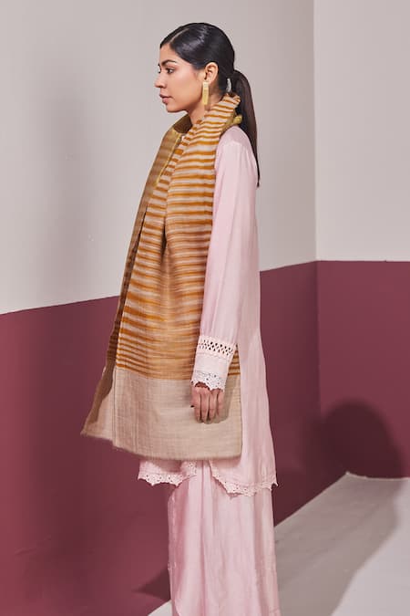 Ochre yellow reversible stole featuring ikkat design weave on one side and golden zari on the other