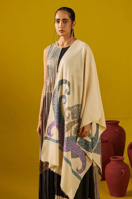 Multicolor handloom Pashmina stole featuring a Kalamkari border design
