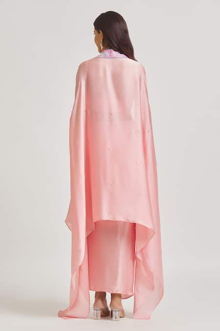 Pink Satin Sequins, Beads Scoop Draped Dhoti Skirt Set With Embroidered Cape