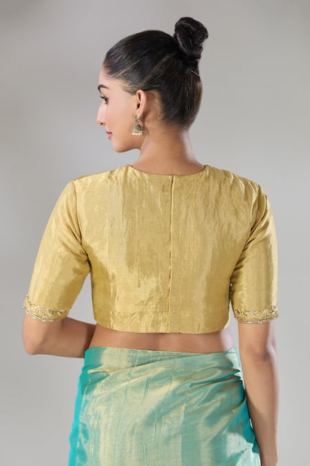 Gold handwoven pure tissue blouse featuring half sleeves and round neckline