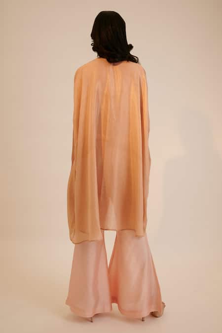 Peach cape tunic featuring floral cutwork embroidery and an asymmetric hem. Paired with a silk bell bottom pant.