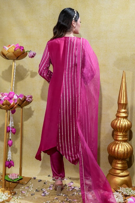 Pink Organza, Satin, Pearls, Lotus Asymmetric Kurta And Pant Set