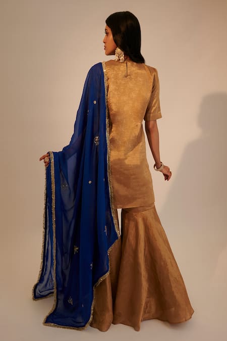 Gold kurta featuring half sleeves and a closed neck design. Paired with a contrasting blue dupatta adorned with cut dana, bead, sequin, and zari embroidery.