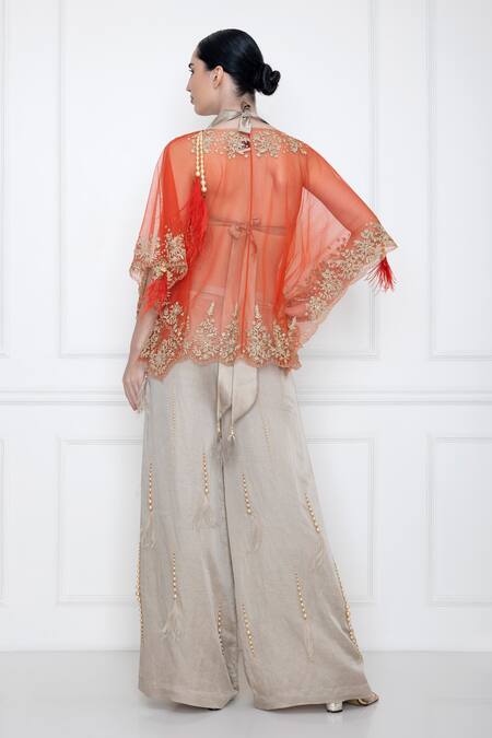 Flame red net draped kaftan top with gold kasab embroidery fringed with pearl and feather tassels.