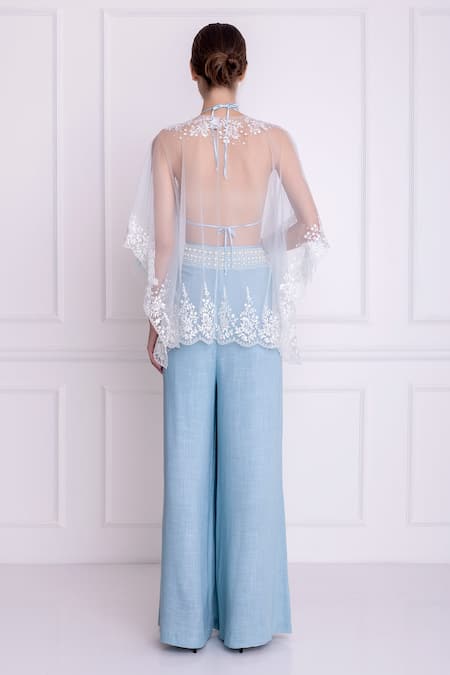 Powder blue sheer net kaftan draped top with ivory thread embroidery & pearl feather tassels.