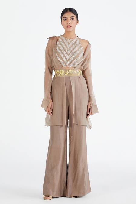 Grey silk organza shirt with roll-up tab sleeves & collar neck. Paired with silk chanderi chevron pattern crop top & flared hem pants. Comes with a floral embroidered belt.