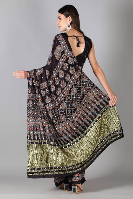 Buy_Sheeshakari_Black Silk Embroidery Printed Saree With Blouse