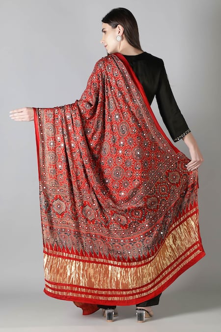 Black silk kurta featuring a straight silhouette and a round neckline. Paired with a red dupatta adorned with intricate patterns and gold accents.