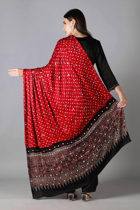 Black silk straight kurta featuring a round neckline and full sleeves. Paired with a red dupatta adorned with intricate embellishments and a decorative border.